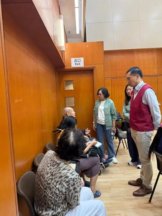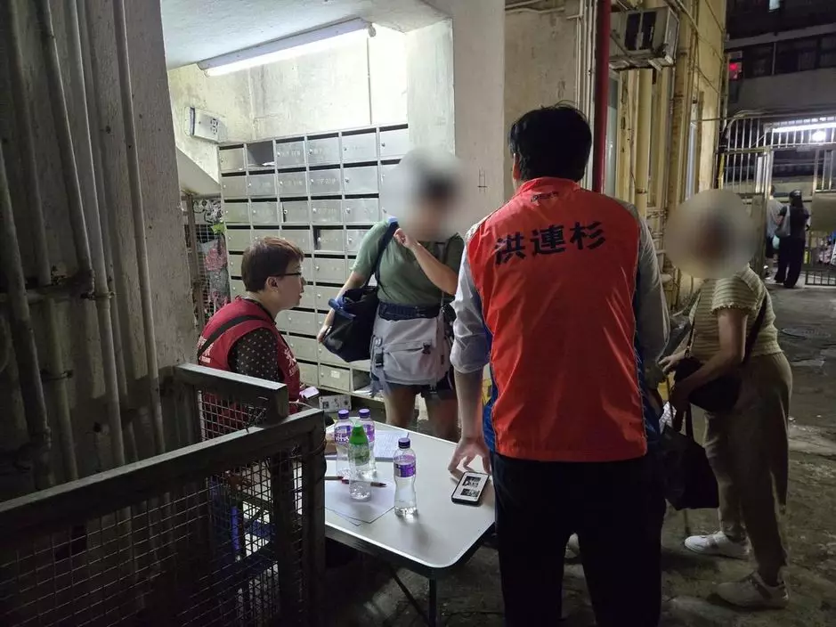 鰂魚涌濱海街一個地盤發現戰時炸彈,民政事務總署全力支援警方疏散居民工作。民政及青年事務局局長麥美娟(中間藍外套)到場了解居民情況。民政事務總署FB圖片