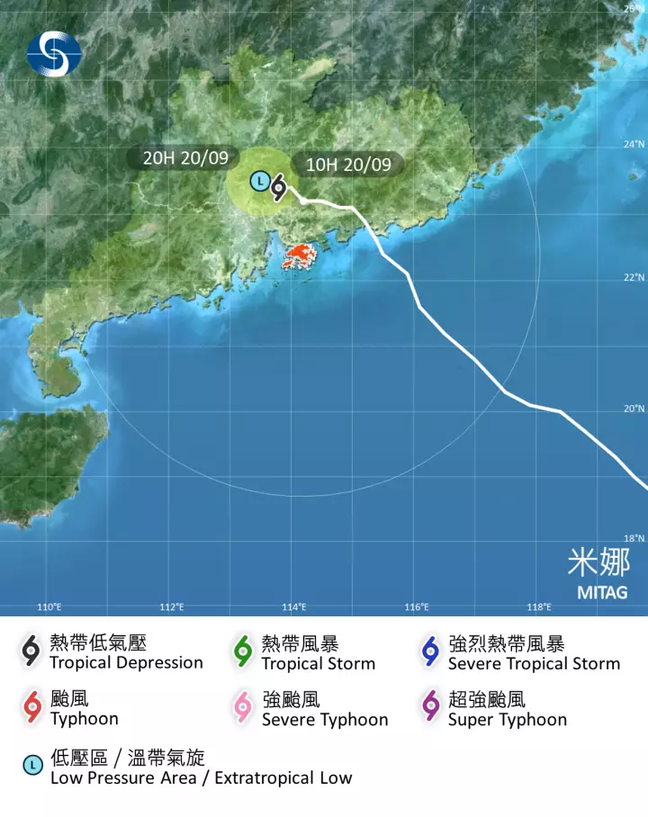 與米娜相關的雨帶仍為珠江口一帶帶來狂風驟雨及雷暴,雨勢有時頗大。海面有大浪及湧浪,市民請遠離岸邊及停止所有水上活動。