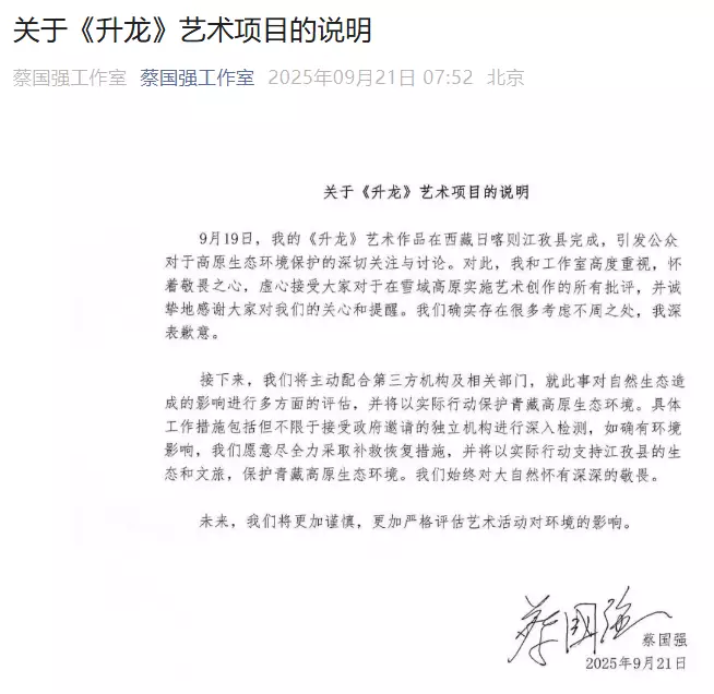 引發風波的藝術家蔡國強同日於微信公眾號「蔡國強工作室」發佈關於《升龍》藝術項目的說明,並對疏忽致歉,稱將配合獨立機構與政府評估環境影響,如有損害將推動補救及支持當地生態文旅,強調對自然敬畏,未來將更加嚴格審慎評估藝術活動影響。