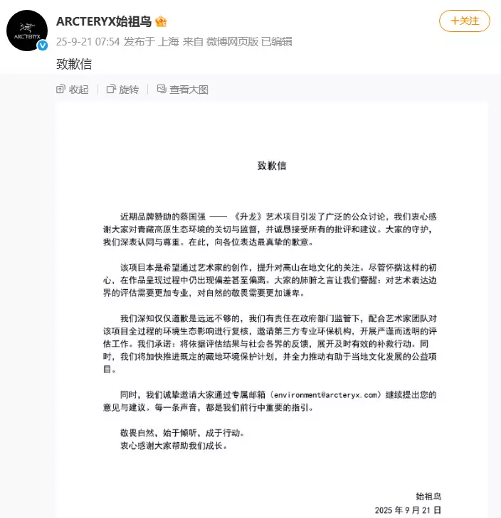 内地戶外品牌始祖鳥聯手藝術家蔡國強近日在喜馬拉雅山燃放藝術煙火,引發環保爭議。21日,始祖鳥官方發佈致歉信,蔡國強亦公開道歉。