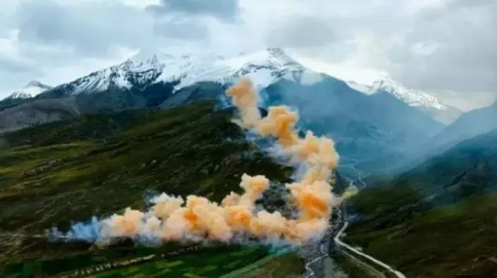 當日傍晚,蔡國強在西藏喜馬拉雅山脈江孜熱龍地區(海拔約5500米)開始燃放藝術煙花。現場視頻顯示,蔡國強通過火藥爆破在山脊點燃三幕煙花,形成「升龍」動態景觀,聲稱象徵東方龍文化中的「吉祥」與「生生不息」精神。