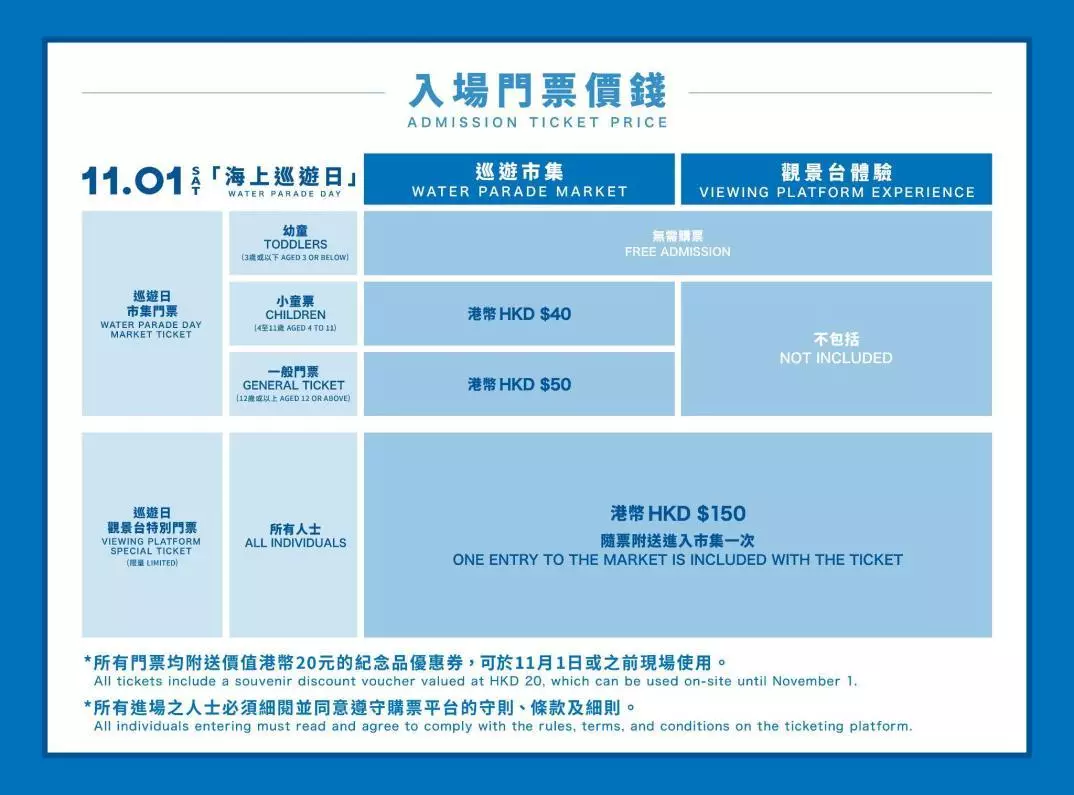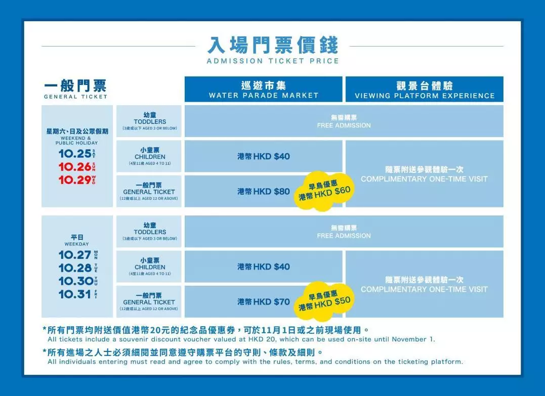 「巡遊市集」早鳥優惠門票於9月26日中午12 時起透過購票平台 KLOOK 預購,成人票由港幣50元起,小童票為港幣 40 元,數量有限,售完即止。另設即場發售門票,視乎現場門票實際發售情況。所有門票均附送價值港幣 20 元的紀念品優惠券,可於11 月1 日或之前現場使用。門票僅供入場,場內消費如紀念品、餐飲與遊戲攤位等須額外付費。門票詳情參閱購票平台細則。