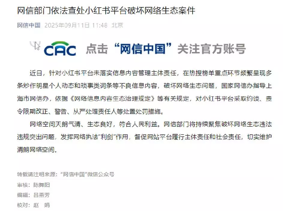國家網信辦指導北京市網信辦,依據《網絡信息內容生態治理規定》等,對兩個平台採取約談、責令限期改正、警告、從嚴處理責任人等處置處罰措施。