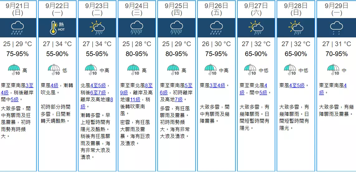 而本港地區星期日天氣預測,大致多雲,間中有驟雨及狂風雷暴,初時雨勢有時頗大。最高氣溫約29度。吹和緩東至東南風,稍後離岸風勢間中清勁。