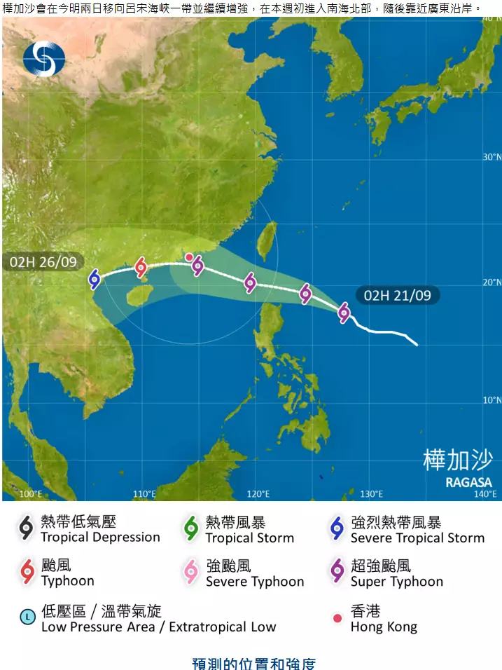 天文台表示按照現時預測,本港星期二、三天氣逐漸轉壞,星期三吹烈風至暴風,天氣惡劣,有狂風大驟雨及雷暴,海有巨浪及湧浪。由於受顯著風暴潮影響,屆時沿岸水位可能與2017年的天鴿及2018年的山竹相若。市民請留意天文台最新天氣消息及做好防風防水浸準備。