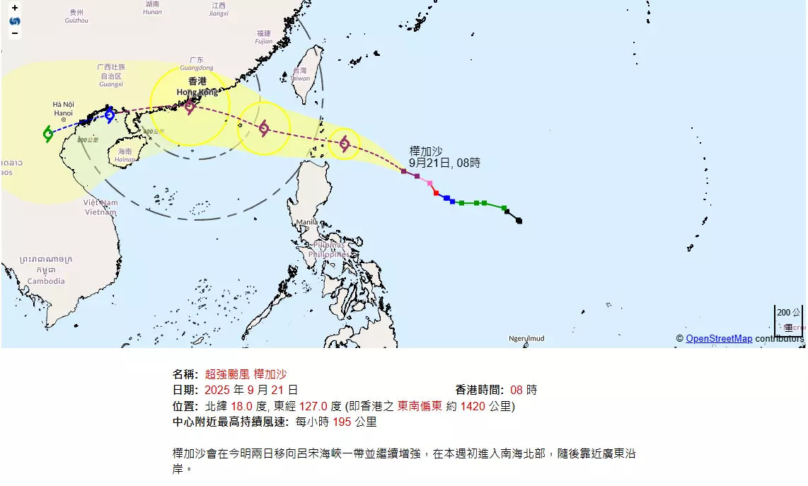 天文台表示,按照目前預測,超強颱風樺加沙會在未來一兩日繼續增強,橫過呂宋海峽一帶並進入南海北部,逐漸靠近廣東沿岸。而在正午12時,樺加沙集結在馬尼拉之東北約720公里,預料向西北偏西移動,時速約18公里,移向呂宋海峽一帶。
