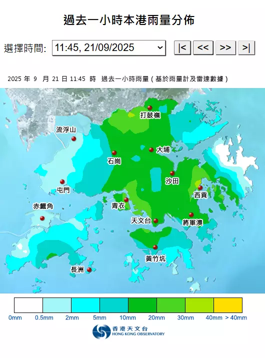 另外與米娜殘餘相關的驟雨正影響珠江口一帶。過去數小時,本港廣泛地區錄得超過30毫米雨量,而中西區、新界東部及大嶼山的雨量更達70毫米左右。
