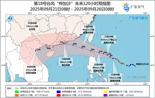 廣東氣象部門預計,超強颱風樺加沙將於星期一(9月22日)凌晨進入南海東北部海面,趨向廣東。受其影響,星期二至四廣東海陸將有一次嚴重風雨影響。