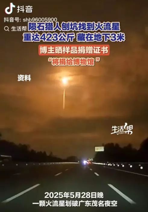 今年5月份,廣東茂名夜空驚現巨型火流星瞬間點亮天際,「隕石獵人」近日挖掘逾10小時尋獲423公斤隕石。證實來自來自45.5億年前小行星。