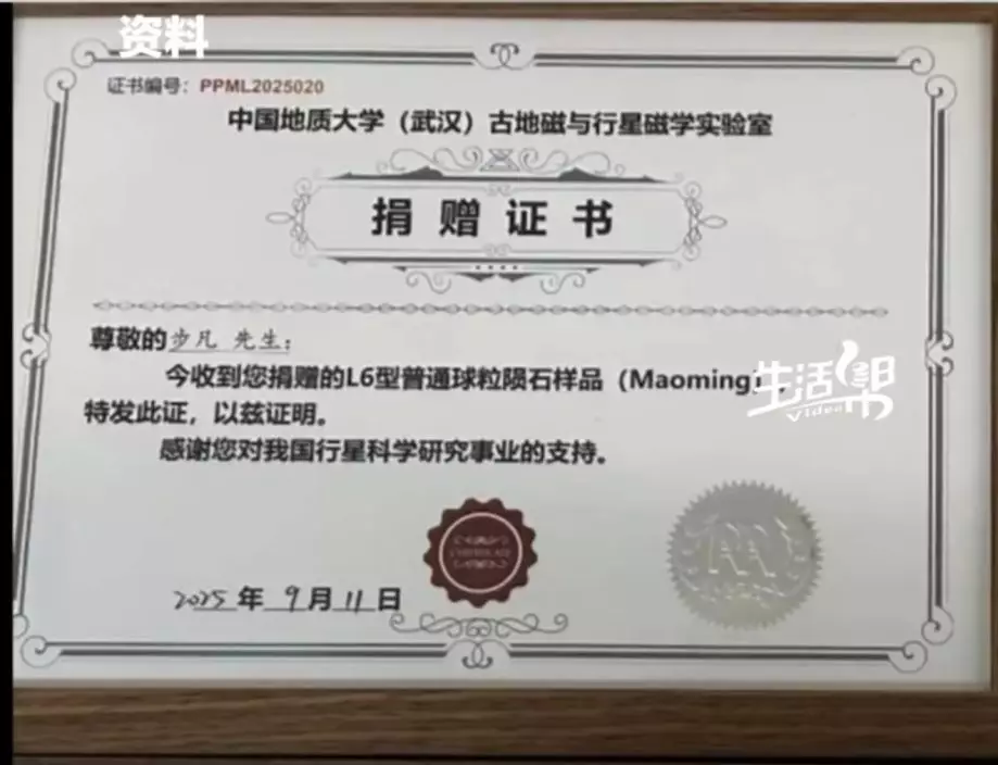 中國科學院紫金山天文台出具證明顯示,該隕石源自太陽系小行星碎片,形成於45.5億年前。專家指出,這是一顆非常新鮮的目擊隕石,墜落時間極短,保存大量原始資訊,具極高科學研究價值。
