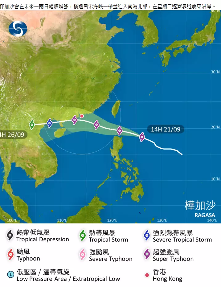 天文台指按照現前預測,超強颱風樺加沙會在未來一兩日繼續增強,橫過呂宋海峽一帶並進入南海北部,逐漸靠近廣東沿岸,天文台會在星期一(9月22日)中午前後發出一號戒備信號。