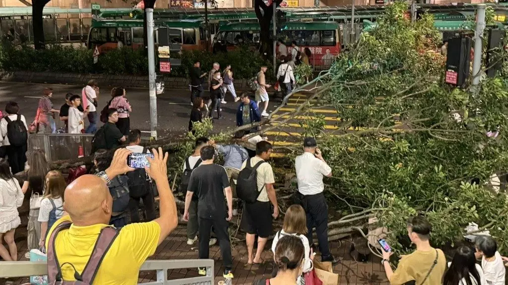 晚上近11點警方接報,指上水港鐵站D1出口的一段新運路,有一棵大樹倒塌,壓著1男3女,其中一名25歲女子傷勢較重,被大樹壓至左腳骨折;另外3名男女(25歲至60餘歲),均頭、手、腳及後背被樹打中,出現紅腫及擦傷等,傷勢較輕。他們由救護車先後送往北區醫院治理。