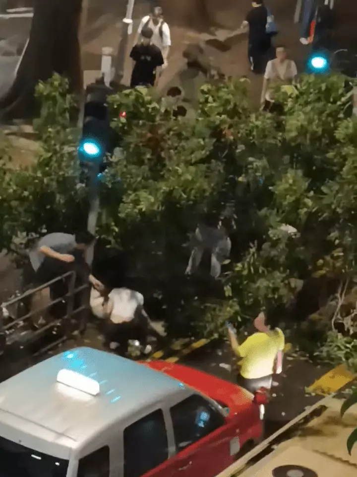 上水站外大大樹倒塌,多名途人走避不及被壓中,途人上前協。網上影片截圖