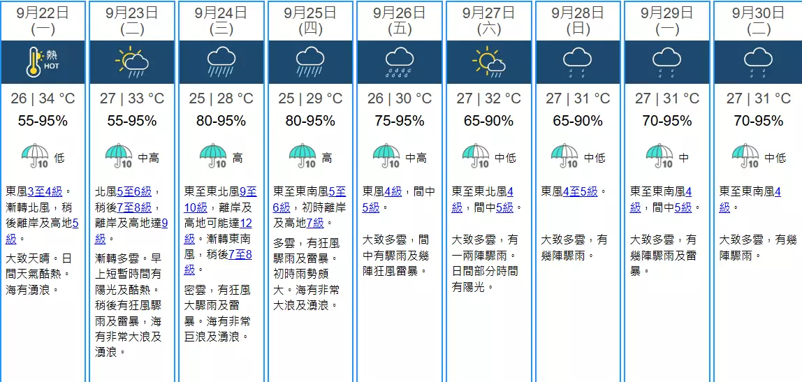 天文台說,樺加沙環流廣闊,雖然星期一(9月22日)本港天色短暫好轉及酷熱,但海有湧浪。星期二稍後天氣開始急速轉壞,星期三吹烈風至暴風,離岸及高地可能達颶風,天氣惡劣,有狂風大驟雨及雷暴,海有非常巨浪及湧浪。星期四風勢逐漸減弱,初時雨勢仍然頗大。