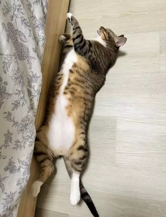 沒想到,昔日孱弱的小貓於2年後竟然「暴風式成長」,化身成圓碌碌的胖虎斑,無論是步行還是靜坐,都顯得憨態可掬,令人忍不住想戳一戳牠的圓肚皮,飼主每次看見都打趣道:「欸?你什麼時候長這麼大啊!」,讓他覺得好笑又幸福感滿滿。