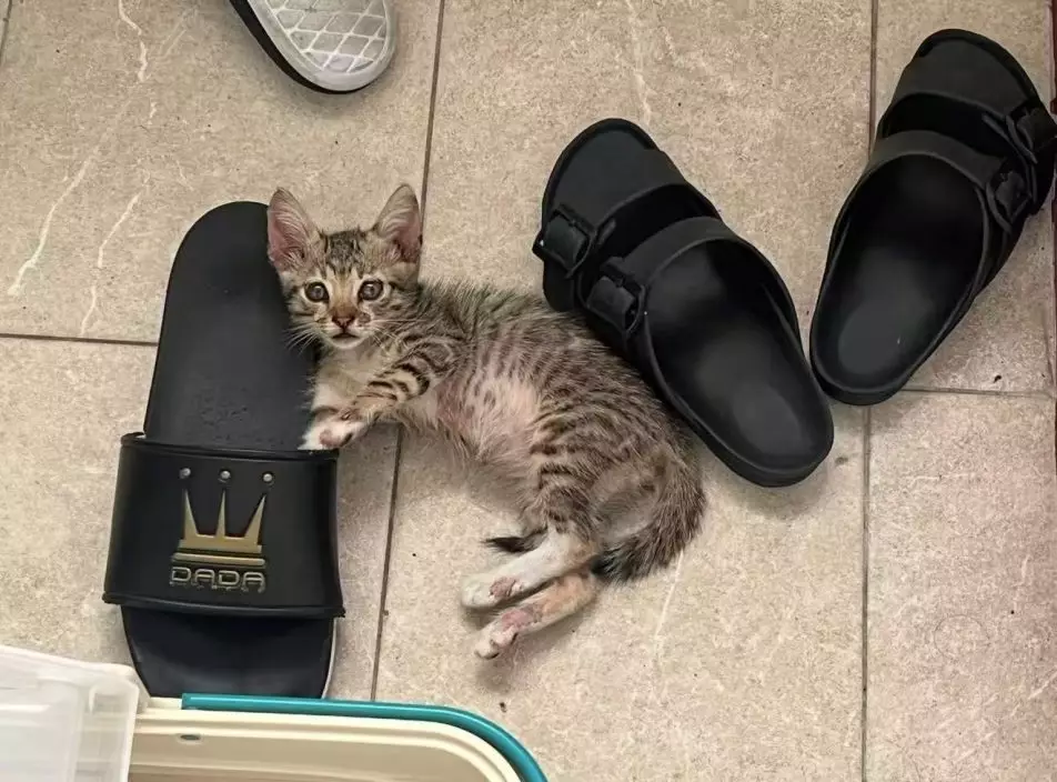 飼主收養拖鞋大孱弱小奶貓