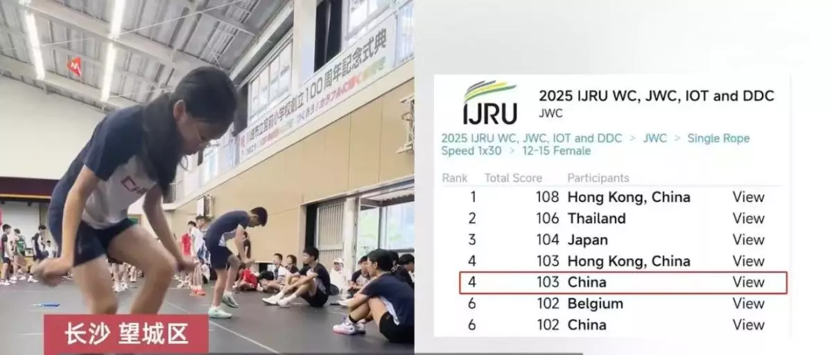綜合內媒報導,湖南長沙望城區一名12歲女童夏佳妮近來於日本舉行的2025年世界跳繩錦標賽中一鳴驚人,首次獨自代表湖南參賽便在3分鐘單搖跳項目中,以997次的優異成績奪得世界第5名,並於30秒速度賽中完成204次,排名第6。高速跳繩時綳繩快得「快到出殘影」,令網民嘆為觀止。