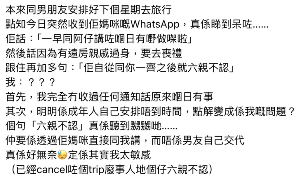 一名女網民原與男友計劃好下周外遊,卻突然收到男友母親的WhatsApp訊息,指責她令兒子「自從同你一齊之後就六親不認」,更透露原來旅行當日撞正男方遠房親戚喪禮!