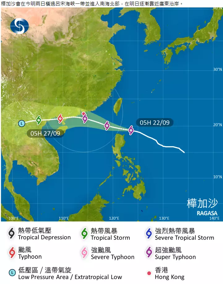 天文台早上發出特別天氣提示,指超強颱風樺加沙會在星期一(9月22日)橫過呂宋海峽並進入南海北部。樺加沙環流廣闊及移動速度較快,對廣東沿岸構成相當威脅。天文台會在下午12時20分發出一號戒備信號。