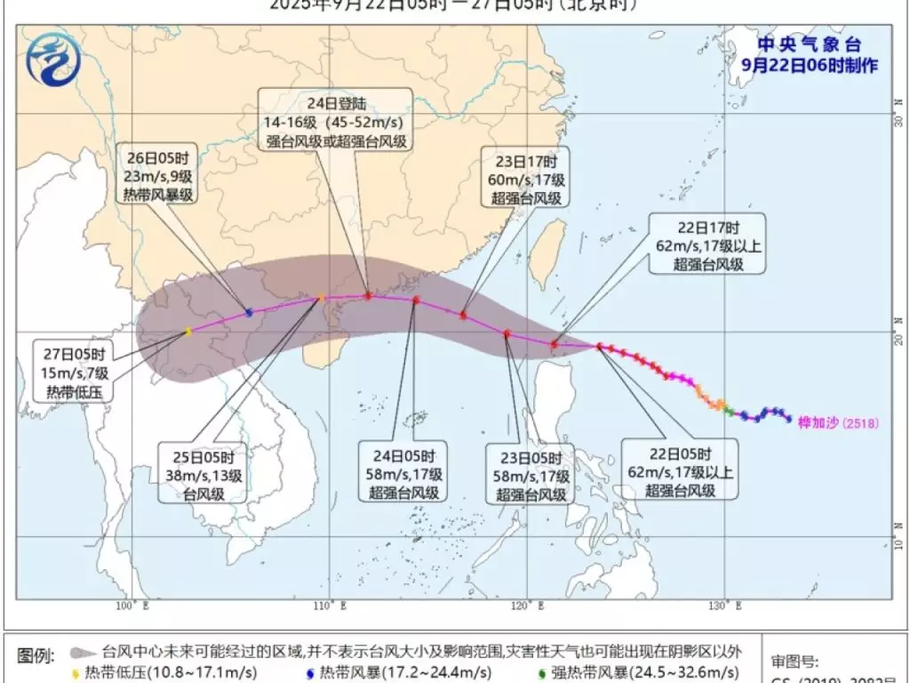 中央氣象台預測,颱風中心經過的附近海域或地區風力可達14至17級、陣風17級以上。