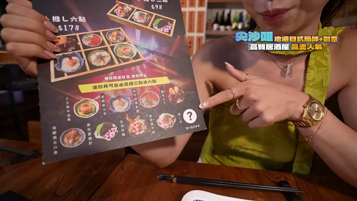 此外,今晚廖慧儀(Jessica)介紹一間高質居酒屋,餐廳的一款「我推的迷你丼」,一次過可以滿足六個願望,她說︰「唔知大家去餐廳食嘢時候,有無選擇困難症。今次呢間日本餐廳嘅丼飯,想一次過可以試勻六款餸,包括刺生、炸物、燒牛肉。仲有一格『問號』應該係每日都唔同菜式。」拍攝當日『問號』提供的為龍蝦刺生。最後Jessica再試店內兩款招牌菜紫蘇元貝豚肉卷及生菜豚肉卷,加上一杯士多啤梨芭菲,絕對滿足。