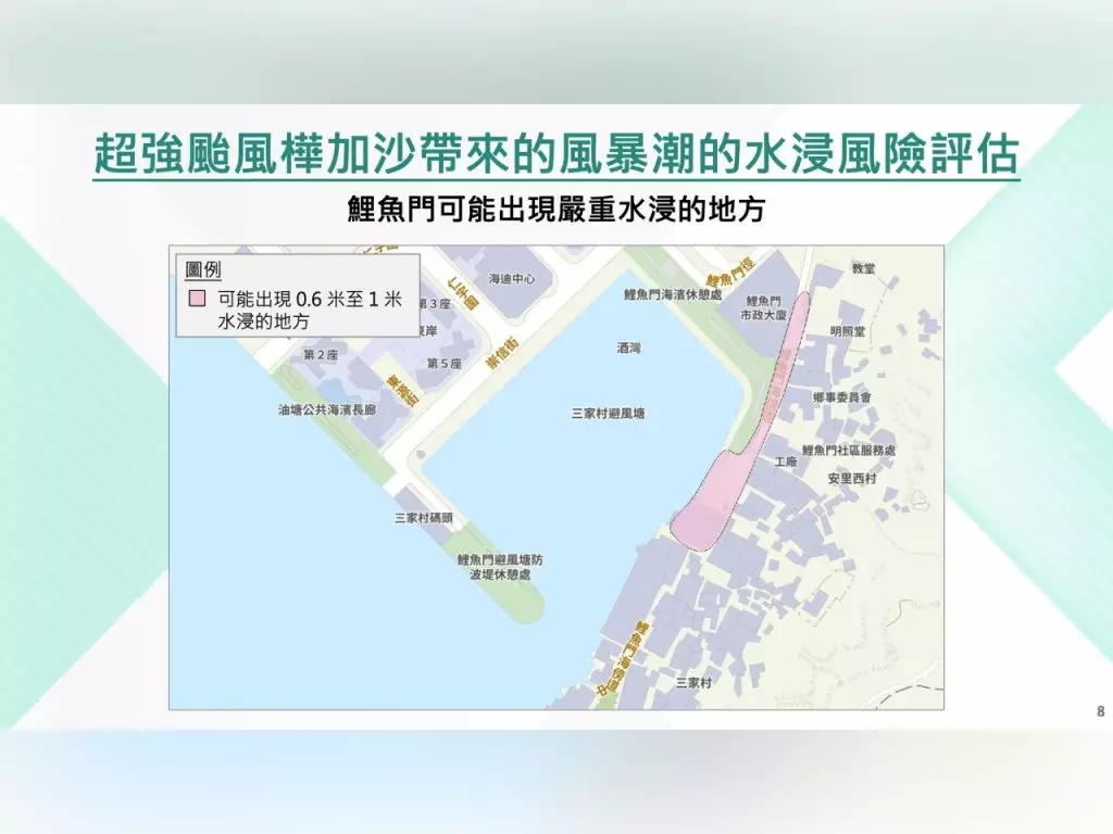 當局發放可能出現嚴重水浸的地方,其中水浸深度可達0.6米至1米的位置包括:大澳的永安街、吉慶街、新基街;鯉魚門海旁道、海鮮街;三門仔新村近海村屋;大埔舊墟汀角路、大埔墟廣福道;元朗中部的大井圍、橫洲、山貝村、元朗市中心;元朗西北部的流浮山、上下白泥、坑口村、沙橋村;東涌灣的馬灣涌村、沙咀頭、沙螺灣;吉澳漁民村;以及西貢南圍和響鐘。