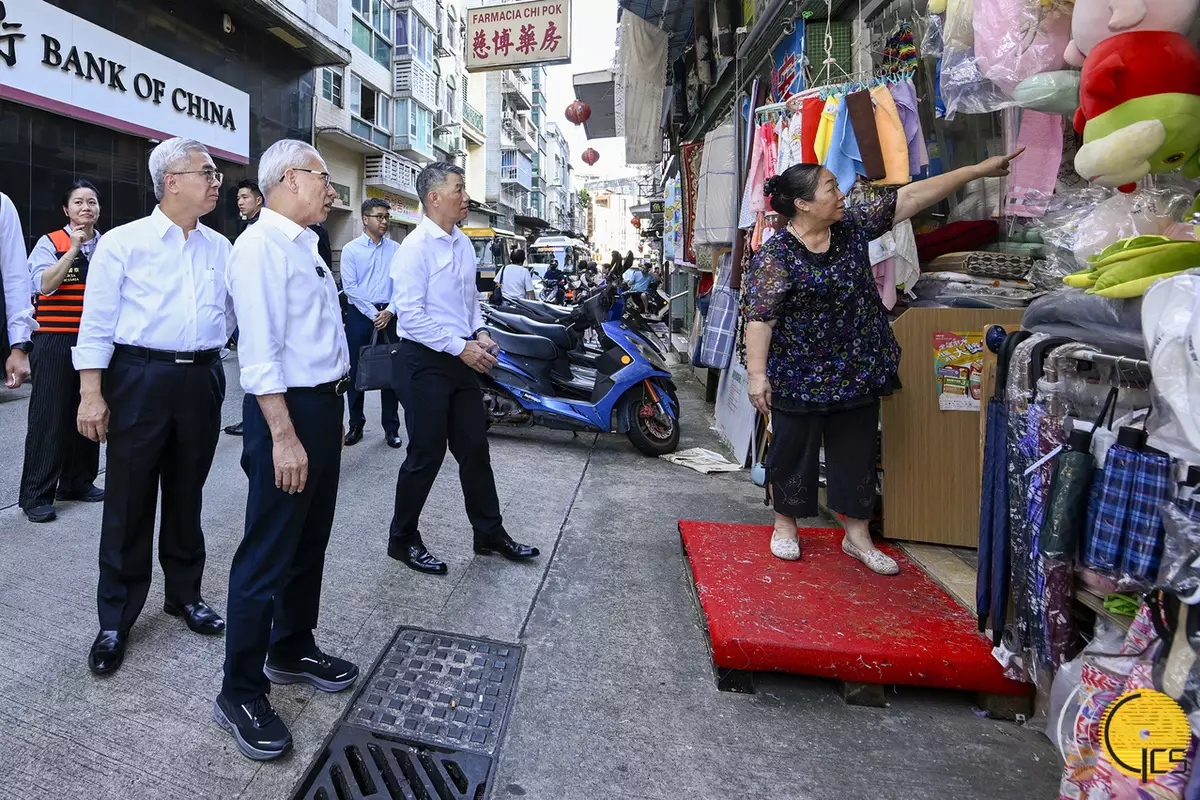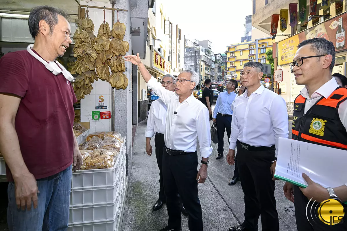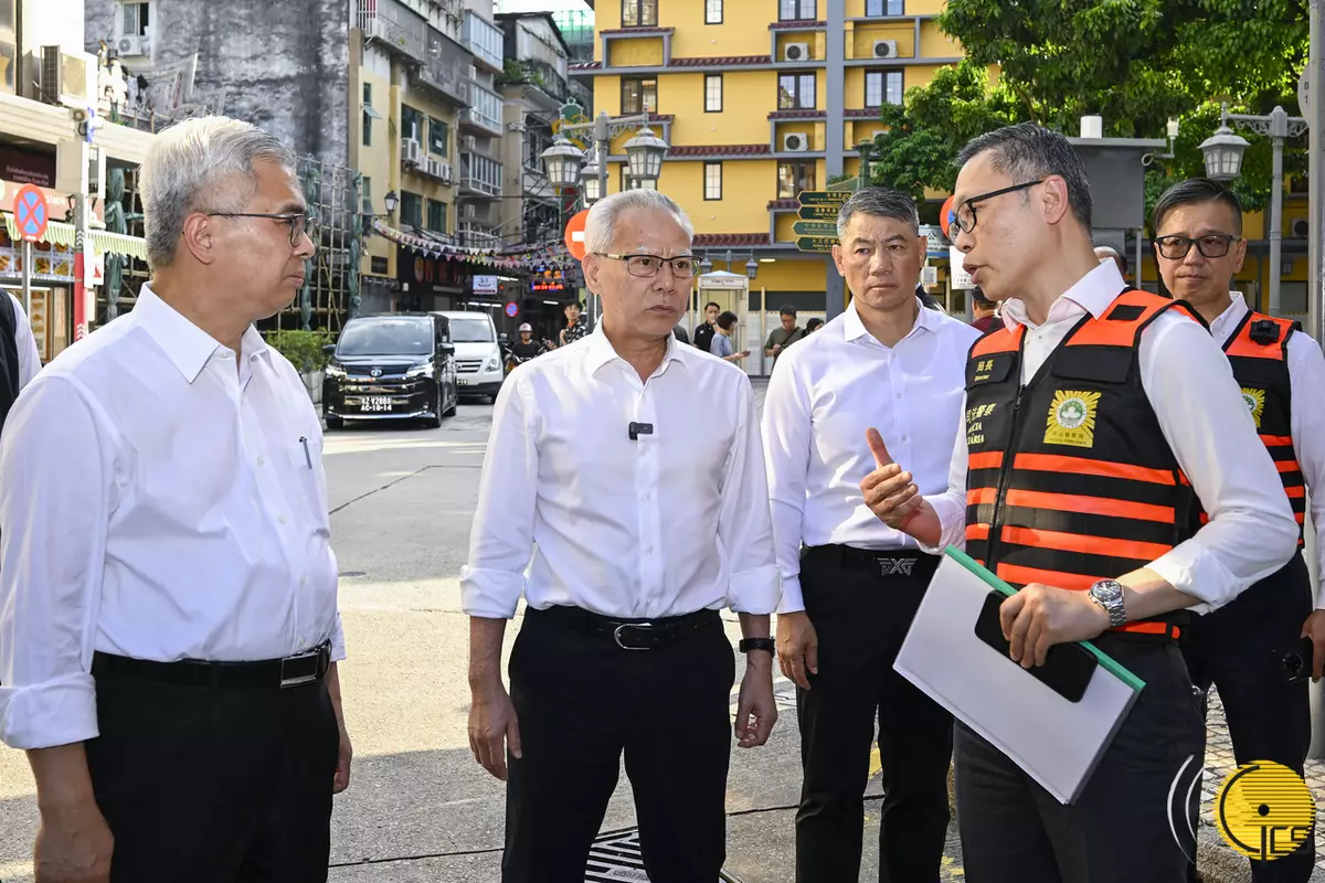 澳門行政長官岑浩輝在保安司司長黃少澤及警察總局局長梁文昌陪同下,到十月初五街一帶視察,關心商户及居民應對颱風的準備情況。澳門新聞局圖片