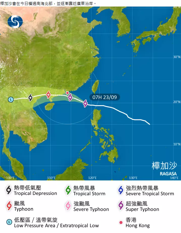 3號強風信號生效,天文台預料超強颱風樺加沙,會維持超強颱風的強度靠近廣東沿岸,天文台將於星期二(9月23日)下午2時20分改發8號烈風或暴風信號。