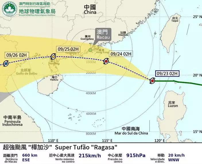 澳門氣象局表示,超強颱風樺加沙已經進入南海北部,未來數日以較快速度,向西北偏西方向移動,加上環流相當廣闊,澳門今天稍後風勢將會顯著增強,預告星期三凌晨改發九號風球機會是高,同日清晨有較高機會改發十號風球。