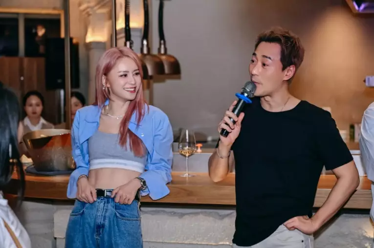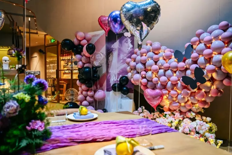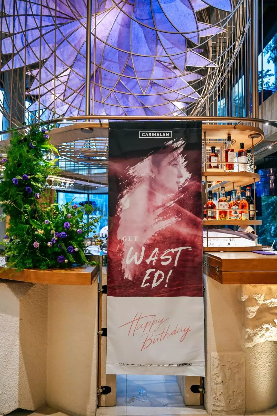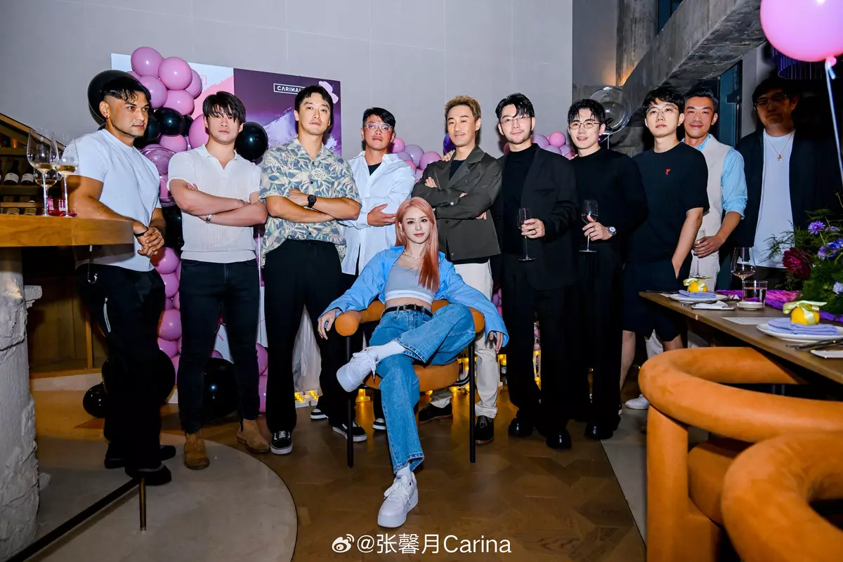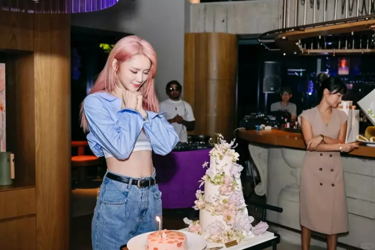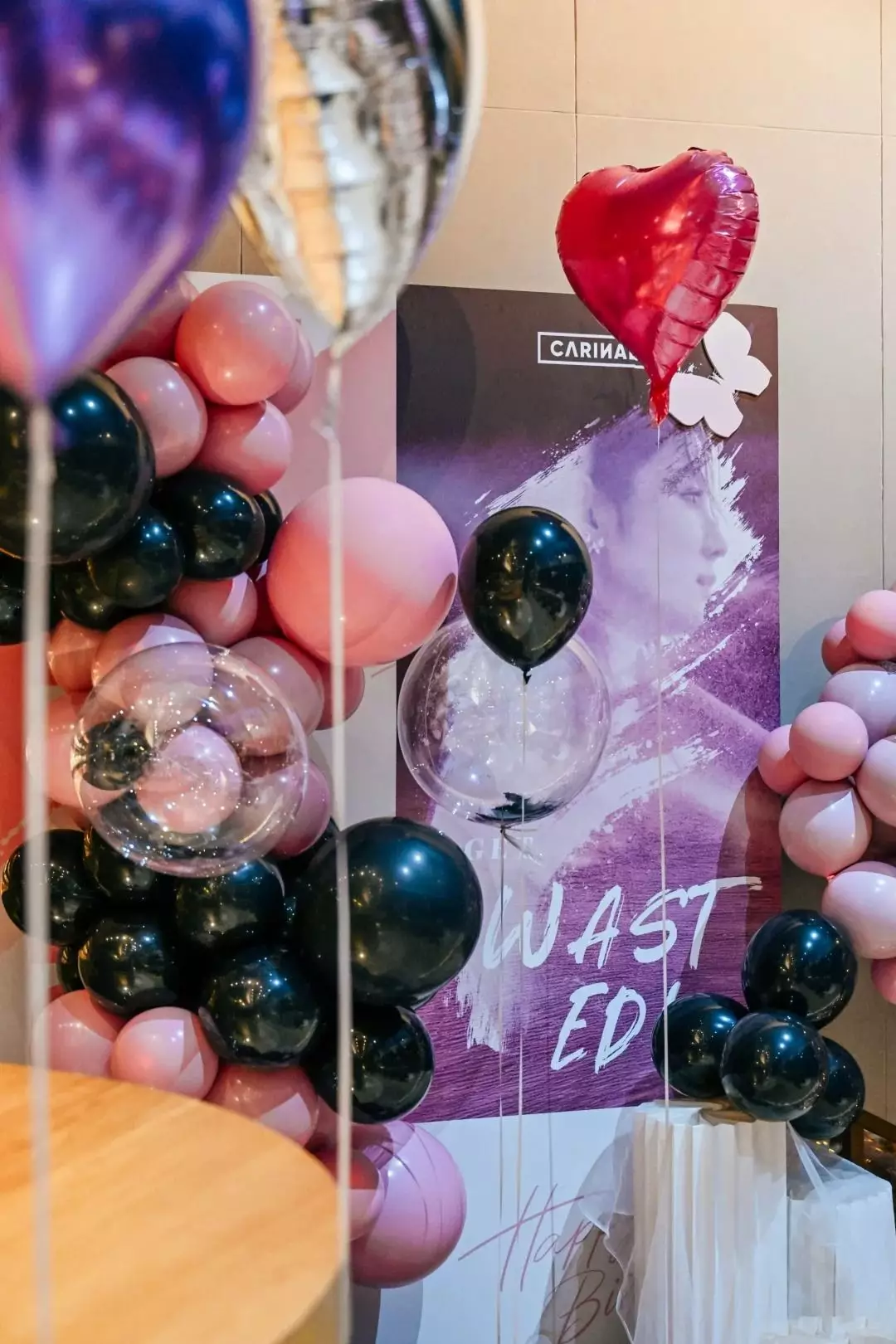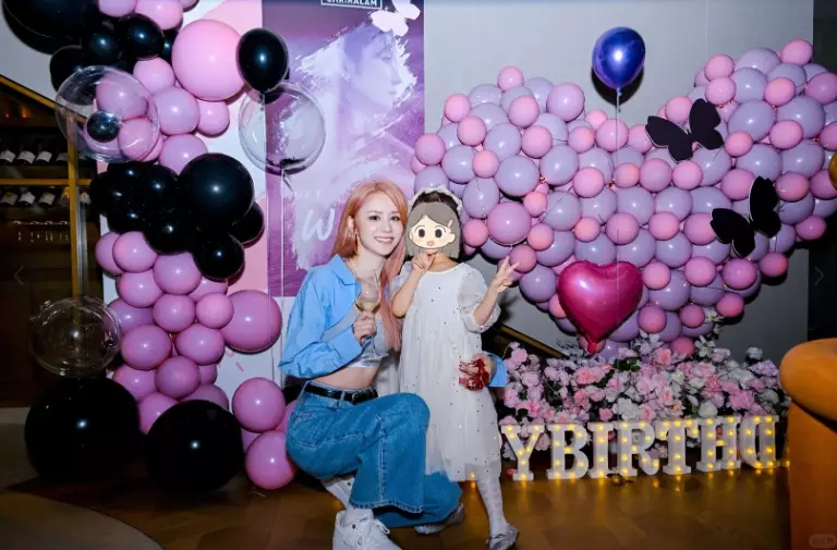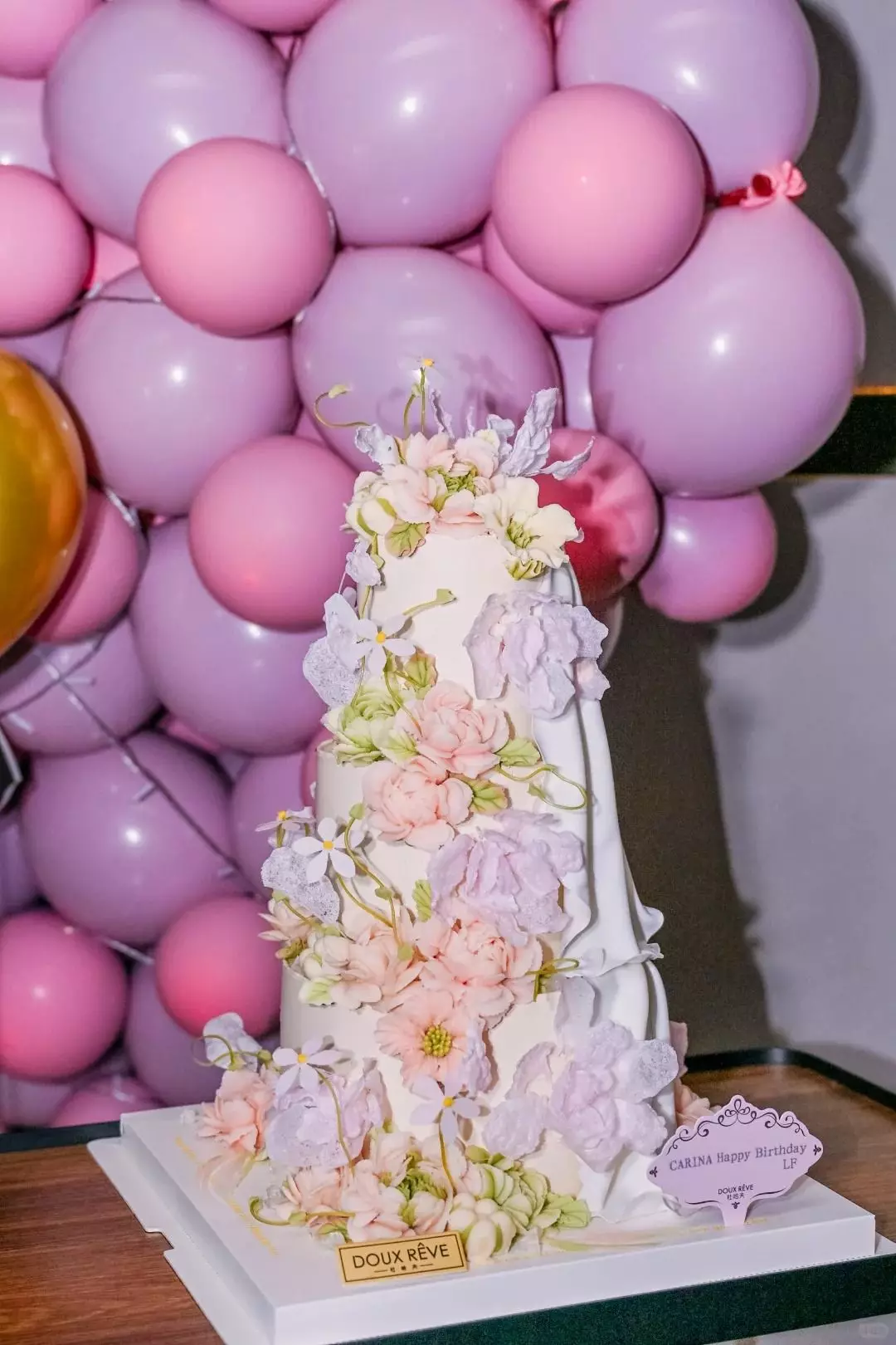 此外,生日派對入口處掛着壽星女的個人靚靚海報,搭配以紫色、粉紅色為主的氣球,以及鮮花組成的夢幻花海,不但有DJ駐場表演,還有靚靚的三層鮮花蛋糕,上面還插着寫上「Carina Happy Birthday lp(內地「老婆」的縮寫)」字樣的生日牌,相當有心思!