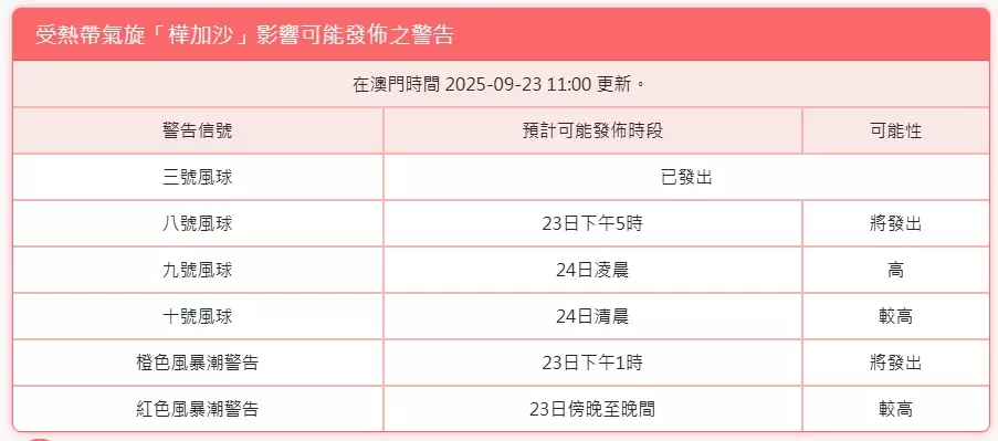 澳門氣象局表示明凌晨發9號風球機會高,清晨10號可能性較高。澳門氣象局網站截圖