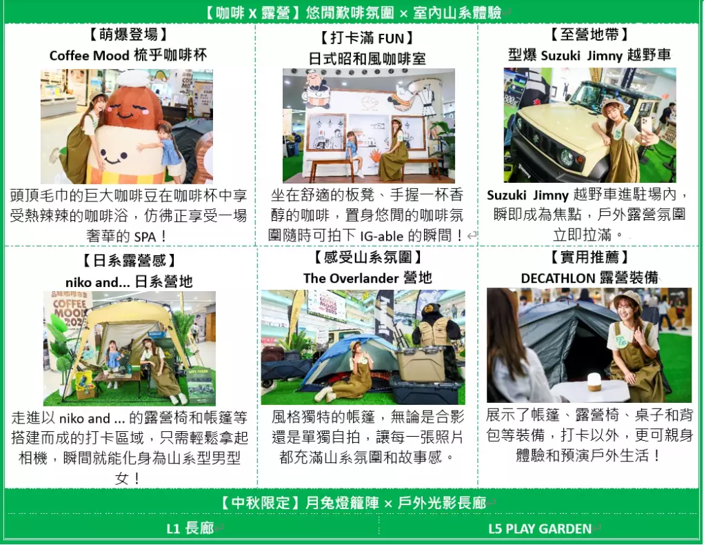 人氣生活品牌niko and... 就以營椅和帳篷等專業露營用品,完美還原了露營場景「niko and…日系營地」,木系風格加上露營布置,文青感滿分,IG打卡一秒出片。「The Overlander營地」帶你走入野外,感受山系氛圍,而「至營地帶」更有型爆的Suzuki Jimny越野車駛入,完美呈現戶外露營氛圍。假若想入門初嘗露營樂的話,一定要預留時間體驗DECATHLON 露營裝備,展示多款「實用推薦」的入門露營裝備!