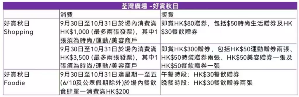由9月30日起至10月31日,顧客只需於時尚、運動及美容等商戶消費滿指定金額,即可獲高達HK$380贈券。購物以外,於場內歎餐飲美食同樣可享優惠,由9月30日至10月31日期間,(6/10及公眾假期除外) 在指定餐飲商戶消費滿HK$200,即可獲贈高達HK$90餐飲贈券,輕鬆品嚐美食,暢享購物樂趣,體驗一場充滿驚喜的秋日優惠盛宴!