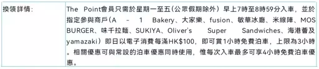 The Point會員只需於星期一至五早上7時至8時59分入車,於指定商戶即日以電子貨幣累積消費每滿HK$100,即享免費泊車1小時,每次可享最高4小時免費泊車。指定參與人氣商戶包括:A1 Bakery、大家樂、敏華餐廳、MOS BURGER、fusion、yamazaki等,讓大家可邊食、邊買,輕鬆享優惠,打造完美活力早晨!