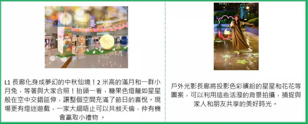 佳節將至,怎少得「中秋限定」的月兔燈籠陣 × 戶外光影長廊, L1長廊掛上逾百個糖果色燈籠,萌兔與滿月造景可愛登場,與你共度最療癒中秋,節日感滿滿;至於L5 PLAY GARDEN 則化身戶外光影長廊,投影出色彩繽紛的星星和花花,夜晚拍照更顯夢幻。節日氛圍滿滿的中秋夢幻仙境,勢必是今年中秋最具人氣的打卡好去處!快來和朋友一起創造動人的回憶吧!