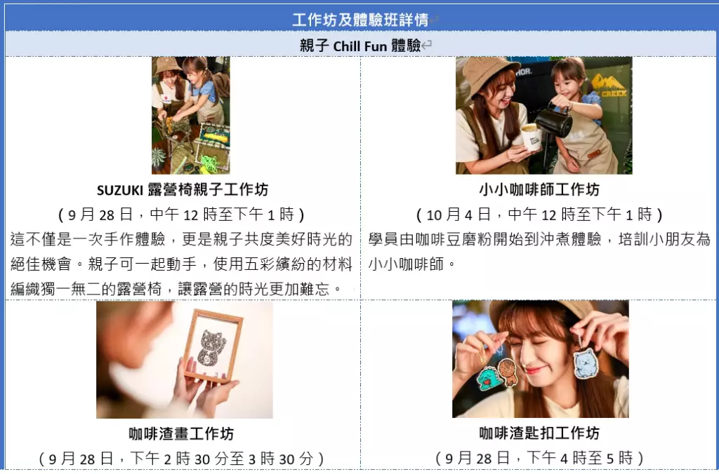 荃灣廣場將咖啡文化玩出新高度!為了讓「荃」民投入【秋季咖啡露營祭】,特別策劃了一系列親子互動工作坊及4大專業級咖啡比賽,讓每一位參加者都可以從不同角度了解咖啡世界,從玩樂中學習,從體驗中加深對咖啡的了解及興趣,當中親子 Chill Fun 體驗,包括親子可一起動手,使用五彩繽紛的材料編織獨一無二的露營椅的「SUZUKI露營椅親子工作坊」;發掘咖啡界明日之星的「小小咖啡師工作坊」等。大人專屬、Gen Z必玩則有「品味咖啡工作坊」及「立體咖啡拉花工作坊」。另外更不能錯過4大咖啡比賽,囊括創意、手沖、杯測及烘焙4大範疇,勝出者可獲豐富咖啡器材禮品,一眾咖啡師們務必參加!