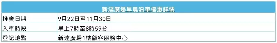 一日之計在於晨,新達廣場由9月22日至11月30日推出「早晨泊車優惠」,方便早起的有車人士可,可以泊好車、吃個早餐,享受早晨悠閒,才輕鬆出發送孩子上學、班、甚或在商場內補給日常所需!