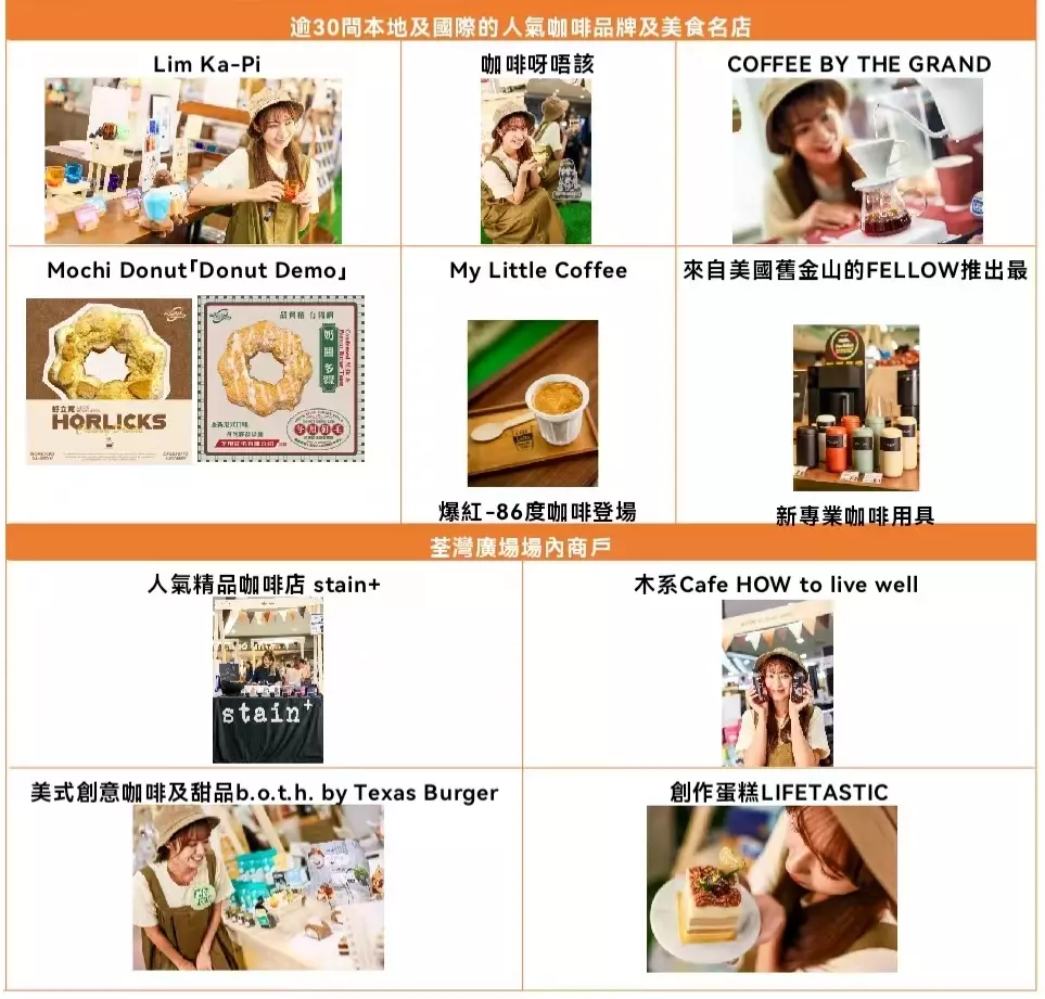 咖啡迷必去!年度矚目咖啡盛事Coffee Mood 品味咖啡市集今個秋季強勢回歸荃灣廣場!由即日起至10月8日,逾30間本地及國際人氣咖啡與美食名店雲集荃灣廣場,為大家帶來一場咖啡盛宴!今屆市集的焦點包括首次參展的非洲烏干達莊園咖啡豆,以及多間台灣知名咖啡品牌,必試推介包括以「飲咖啡」的台語發音命名,有著喝好台灣咖啡的含意的「Lim-kapi」、「達文西咖啡」、「蠻荒咖啡」及「飛鼠咖啡」;由DJ阿正創辦的「咖啡呀唔該」,每期均會親自挑選一款最當季、最特別有趣的咖啡豆到市集與大家分享;呈現酒店級咖啡特飲的「COFFEE BY THE GRAND」; 本地咖啡品牌 My Little Coffee 首次於市集推出最近爆紅-86度咖啡,冰涼的杯壁夾雜着絲滑的奶香,引出超豐富層次,更有大量會場限定精品咖啡掛耳包,;來自美國舊金山的FELLOW推出最新專業咖啡用具,更破天荒首次推出市集Popup優惠價9折等等,更有最適合搭配咖啡、新鮮即製麻糬冬甩的「Donut Demo」等。