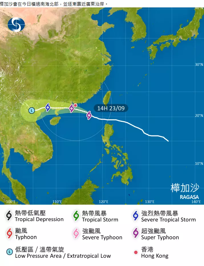 天文台表示過去數小時,樺加沙繼續移近香港。按照現時預測,樺加沙會維持超強颱風的強度,於星期三(9月24日)早上最接近珠江口一帶,本港風力將進一步增強。天文台會視乎樺加沙與香港的距離及本地風力變化,評估晚上較後時間至星期三初時是否需要改發更高熱帶氣旋警告信號。
