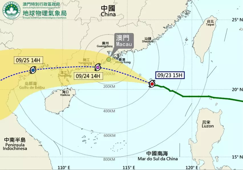 澳門氣象局表示,將在下午5時改掛八號風球,而24日凌晨發出九號風球可能性高,到清晨時亦有較高可能要懸掛十號風球。