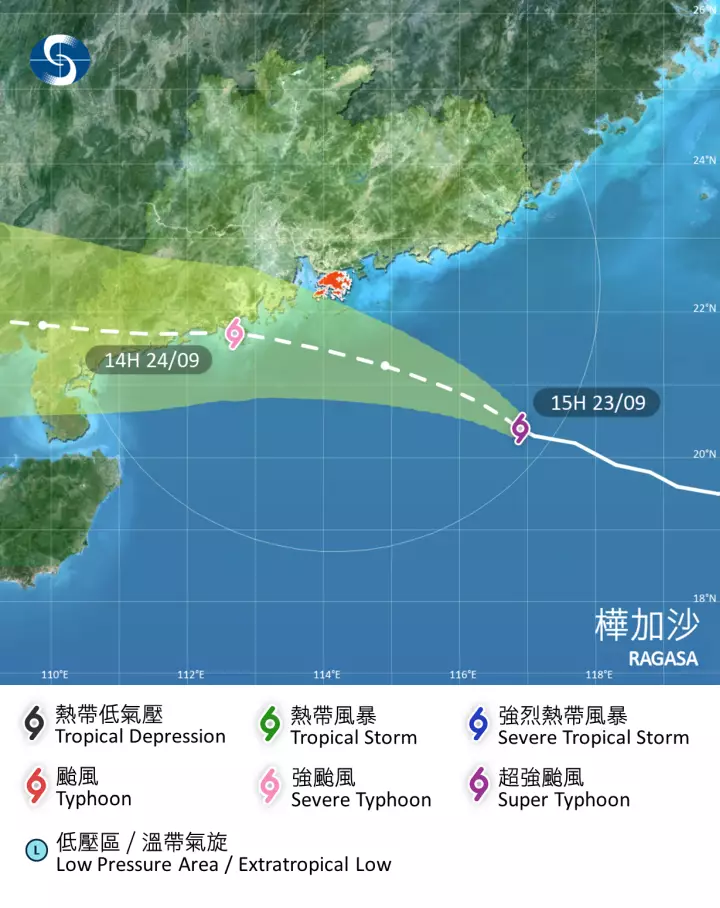 天文台表示,樺加沙將維持超強颱風的強度,預料會在24日早上最接近珠江口一帶,隨後在香港以西登陸,而「西登」對香港的影響較「東登」更大。