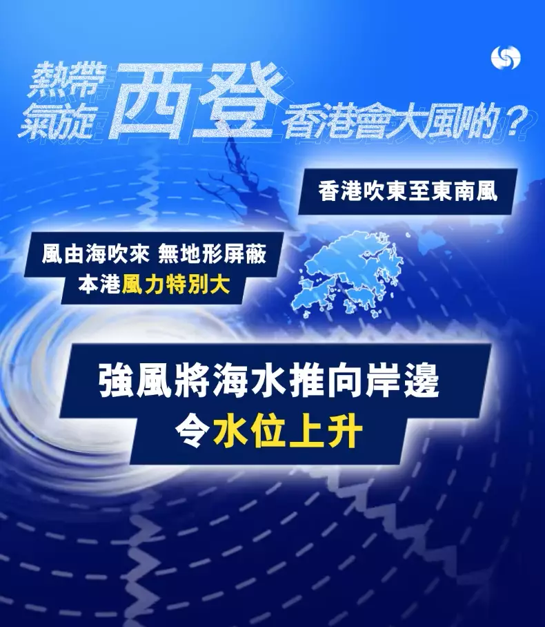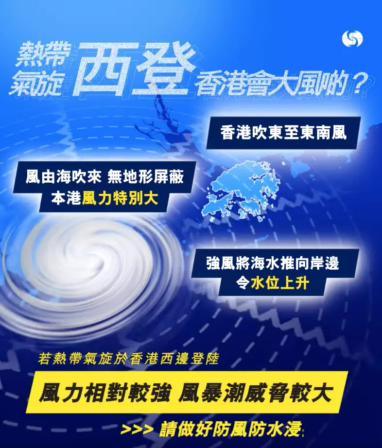 天文台在社交專頁表示,當熱帶氣旋於香港南面掠過並在香港西面登陸,屆時香港會轉吹東至東南風。由於風由海吹來,沒有地形屏障,本港受到的風力不會顯著減弱,風更會把海水推向岸邊,造成風暴潮。