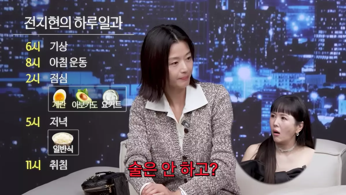 除了公開戀愛史,全智賢更透露自己沒有請幫傭,全是自己一手一腳處理家務事, 洪真慶現場認證:「她真的沒請人幫忙,拍《暴風圈》時行程很滿,但她還是自己洗衣、打掃、洗碗。」 擁有完美體態的全智賢,在節目中公開了自己每天的常規行程,首先每天清晨六時起身,進行空腹運動 ,之後在中午2時進食午餐,以蛋白質為主,隨後在5時進食晚餐,約晚上11點睡覺。幾乎不喝酒的全智賢表示「一旦規律被打破,身心都會感到動搖。」