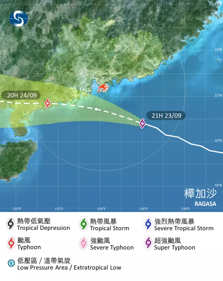 天文台表示,按照現時預測,超強颱風樺加沙會於周三早上最接近珠江口一帶,本港風力將進一步增強。天文台會視乎樺加沙與香港的距離及本地風力變化,評估是否需要在晚上11時至周三凌晨3時之間改發更高熱帶氣旋警告信號。