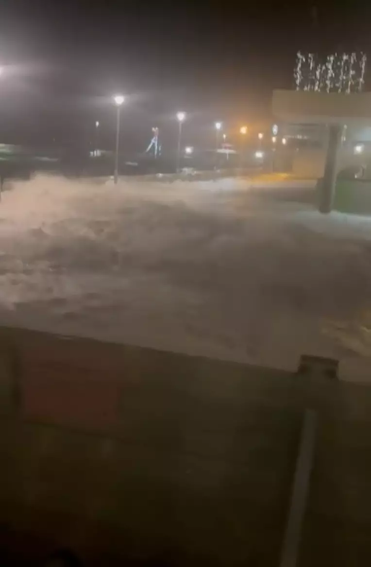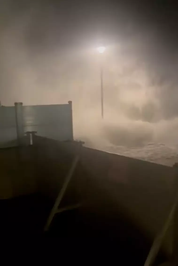 超強颱風樺加沙逼近本港,天氣在晚上轉壞,不時下雨。在柴灣的杏花邨,大浪不斷拍打岸邊,海水淹浸近岸的行人路。