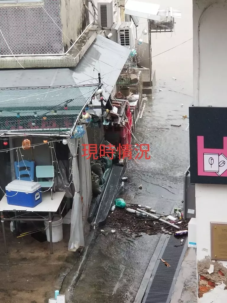 十號颶風信號生效,大澳海水水位不斷上漲,大澳鄉委會主席何紹基說,現已升高3.1米左右,擔心防浸措施未必可以應付,預料海水會倒灌,令大澳街道出現水浸。而現時風力猛烈,一出門已聽到很大風聲,令人幾乎站不穩。