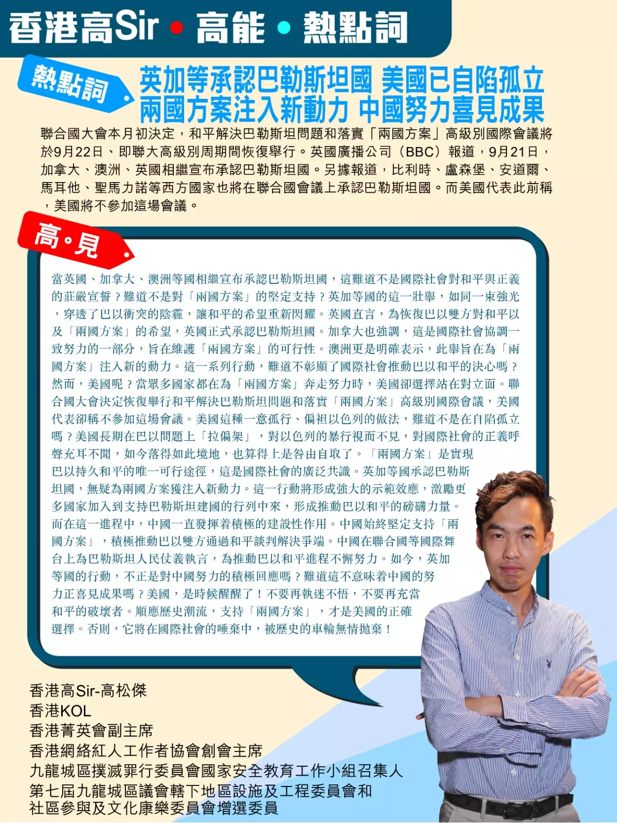 高Sir:當英國、加拿大、澳洲等國相繼宣布承認巴勒斯坦國,這難道不是國際社會對和平與正義的莊嚴宣誓?難道不是對「兩國方案」的堅定支持?英加等國的這一壯舉,如同一束強光,穿透了巴以衝突的陰霾,讓和平的希望重新閃耀。英國直言,為恢復巴以雙方對和平以及「兩國方案」的希望,英國正式承認巴勒斯坦國。加拿大也強調,這是國際社會協調一致努力的一部分,旨在維護「兩國方案」的可行性。澳洲更是明確表示,此舉旨在為「兩國方案」注入新的動力。這一系列行動,難道不彰顯了國際社會推動巴以和平的決心嗎?然而,美國呢?當眾多國家都在為「兩國方案」奔走努力時,美國卻選擇站在對立面。聯合國大會決定恢復舉行和平解決巴勒斯坦問題和落實「兩國方案」高級別國際會議,美國代表卻稱不參加這場會議。美國這種一意孤行、偏袒以色列的做法,難道不是在自陷孤立嗎?美國長期在巴以問題上「拉偏架」,對以色列的暴行視而不見,對國際社會的正義呼聲充耳不聞,如今落得如此境地,也算得上是咎由自取了。「兩國方案」是實現巴以持久和平的唯一可行途徑,這是國際社會的廣泛共識。英加等國承認巴勒斯坦國,無疑為兩國方案獲注入新動力。這一行動將形成強大的示範效應,激勵更多國家加入到支持巴勒斯坦建國的行列中來,形成推動巴以和平的磅礴力量。而在這一進程中,中國一直發揮着積極的建設性作用。中國始終堅定支持「兩國方案」,積極推動巴以雙方通過和平談判解決爭端。中國在聯合國等國際舞台上為巴勒斯坦人民仗義執言,為推動巴以和平進程不懈努力。如今,英加等國的行動,不正是對中國努力的積極回應嗎?難道這不意味着中國的努力正喜見成果嗎?美國,是時候醒醒了!不要再執迷不悟,不要再充當和平的破壞者。順應歷史潮流,支持「兩國方案」,才是美國的正確選擇。否則,它將在國際社會的唾棄中,被歷史的車輪無情拋棄!