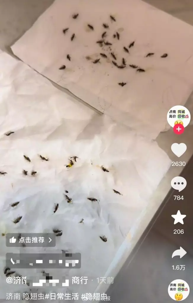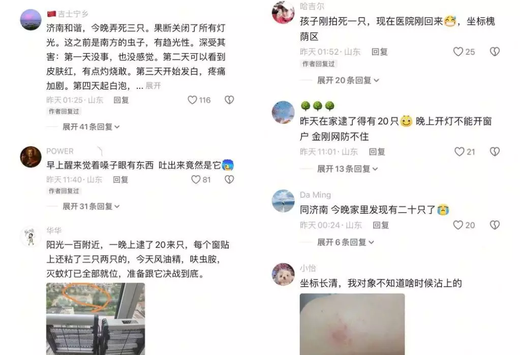 被稱「飛行的硫酸」濟南多地頻現「隱翅蟲」,市民誤觸毒液皮膚紅腫潰爛。微博圖片