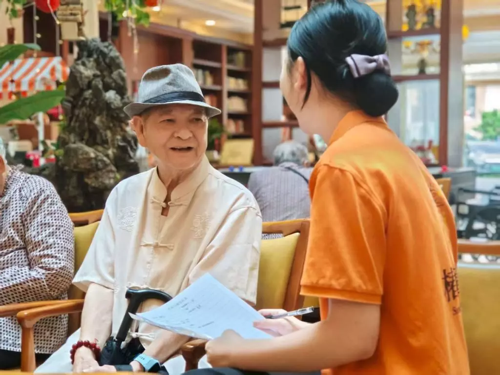 院舍員工定期會向院友陳伯了解社交和護理上的意見。