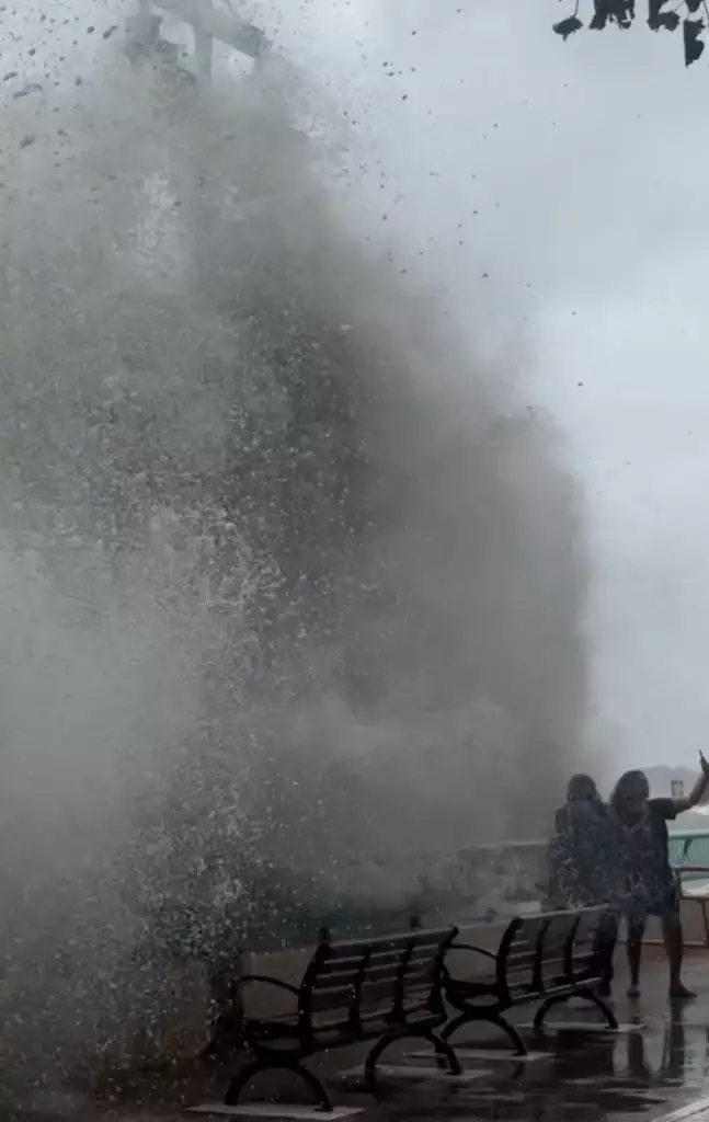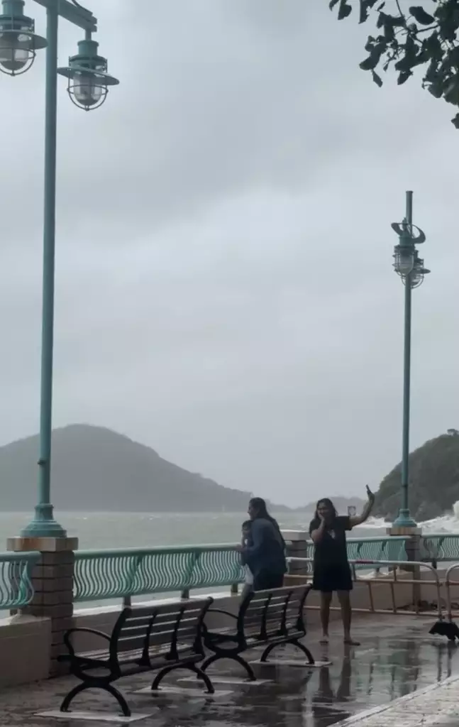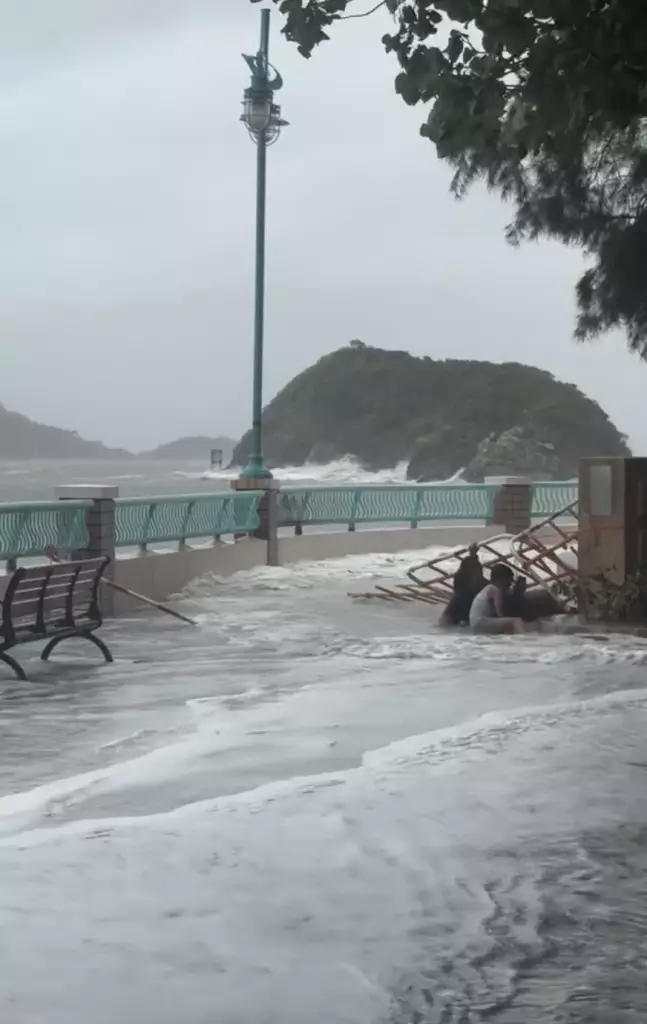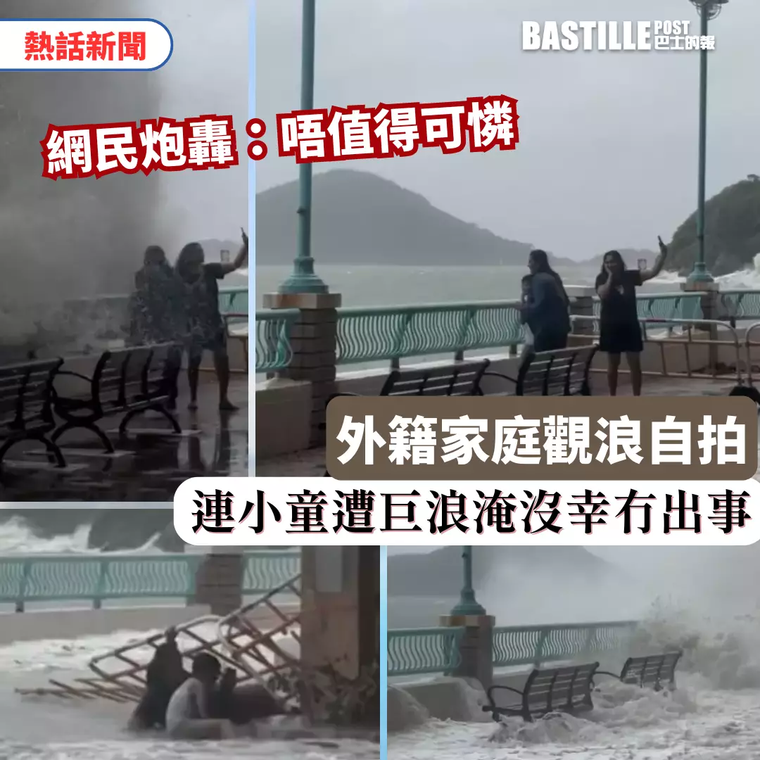 超強颱風樺加沙襲港,星期二(9月23日)有一家4口在柴灣觀浪,結果3人遇險送院。星期三(9月24日)網上再瘋傳一則影片,海怡半島岸邊疑似外籍一家三口觀浪自拍,當中包括2名女子及1名小童,其間數米巨浪突襲,瞬間把3人被淹沒。